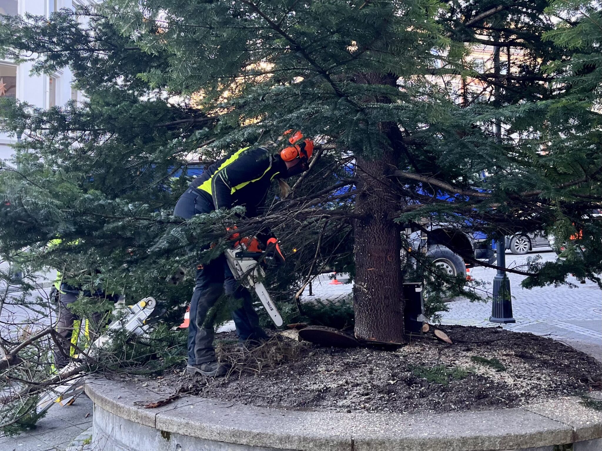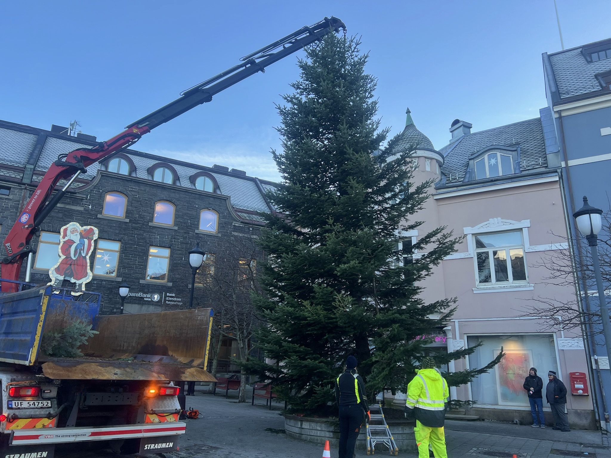 Mens arbeidet pågikk, stoppet mange forbipasserende opp for å følge med. Både lokale og turister lot seg fascinere av oppsettingen av det store treet midt i sentrum. Flere kommenterte hvor flott og høyt det var.