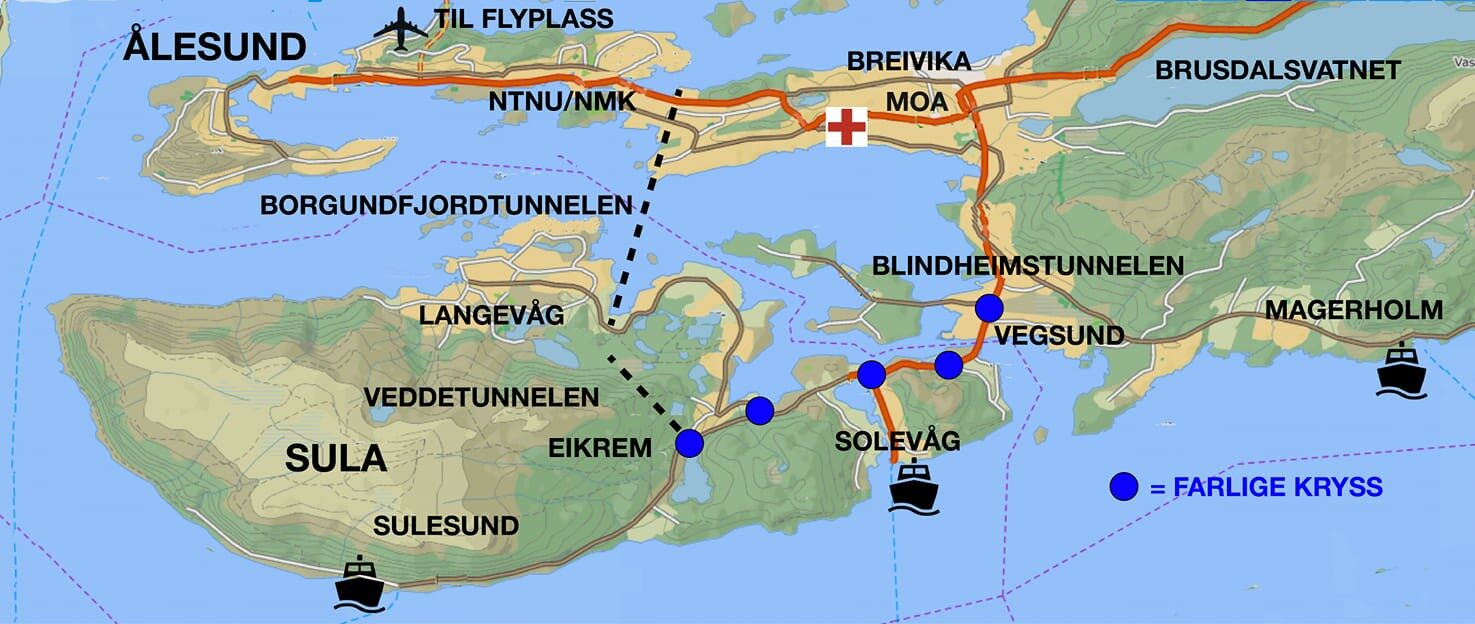 Kartet viser også hvor effektivt Borgundfjordtunnelen kan løse trafikkutfordringene. Sårbarheten reduseres betydelig når forbindelsen mellom Sula og Ålesund øker fra én til to veier, noe erfaring allerede viser. Kortere reisevei og redusert reisetid er store gevinster som styrker både bo- og arbeidsmarkedet i regionen.