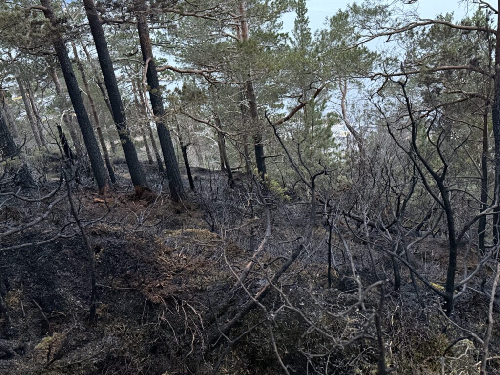 Det er et område på ca. 50×50 meter på sydsiden av Aksla, anslagsvis 200 meter øst for Fjellstua, som brenner.