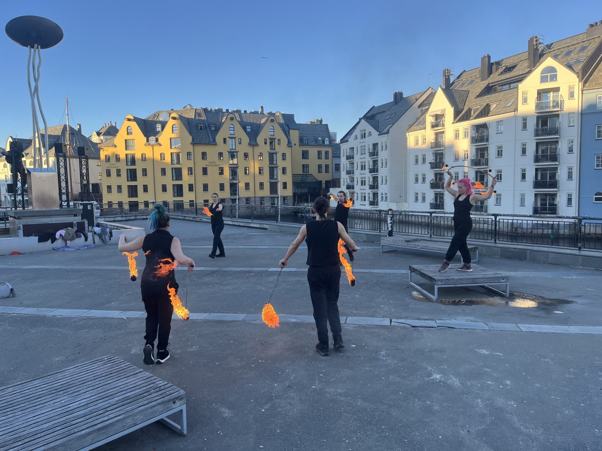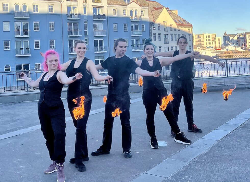 Fredag formiddag la mange kanskje merke til flammedanserne på Dronning Sonjas plass. De øvde til fredagens «Brosundet brenner».