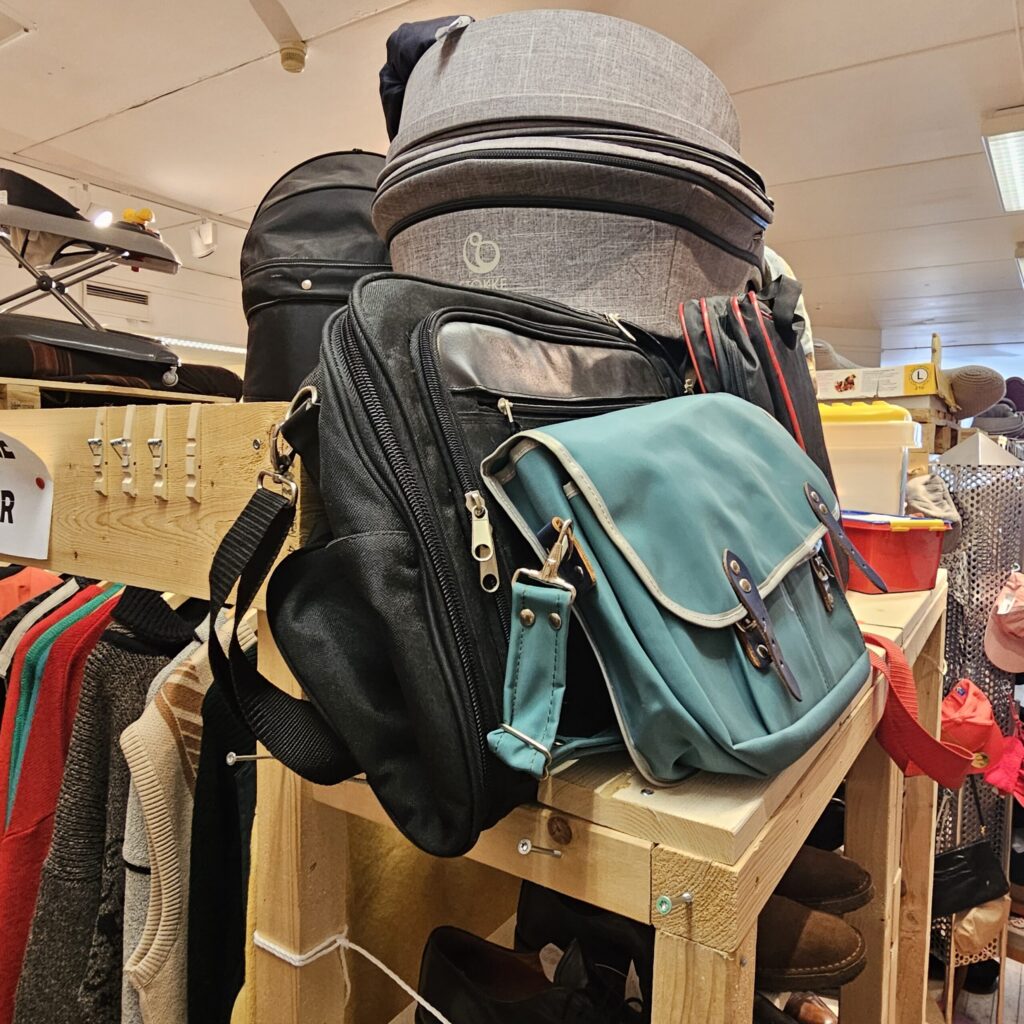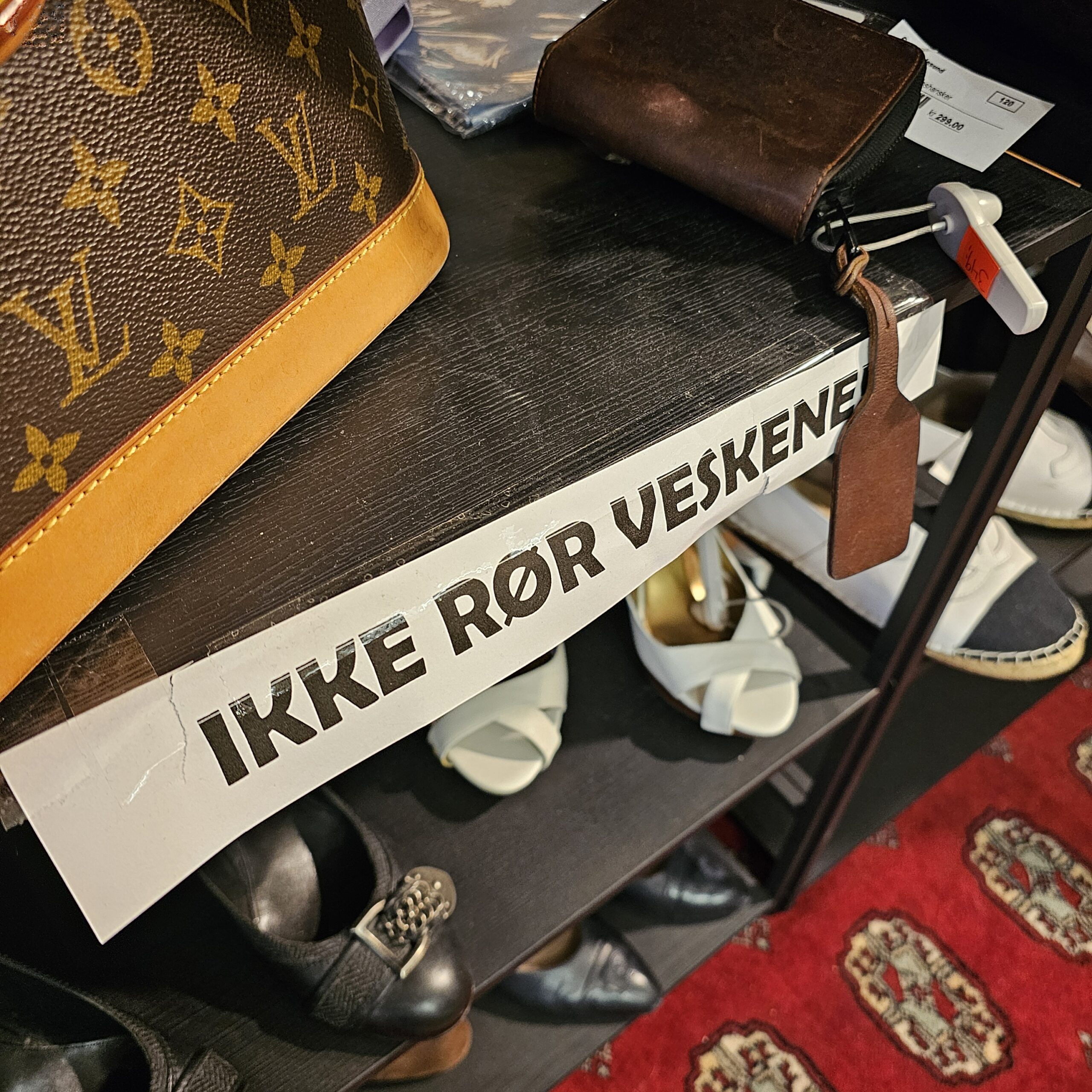 Linn Therese tar meg først bak i butikken, der hun viser frem hyllen med de to omtalte veskene. Jeg får beskjed om å velte de, men det går rett og slett ikke uten å bruke litt kraft. Der er en fjøl som hindrer fallet.