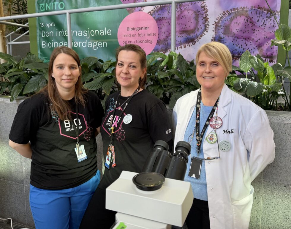 Monica Årvik, Anne Elin Varhaugvik og Heidi Engstrøm markerte Bioingeniørdagen med stand og aktiviteter ved NTNU i Ålesund. Foto: Anne Solveig B. Trandal